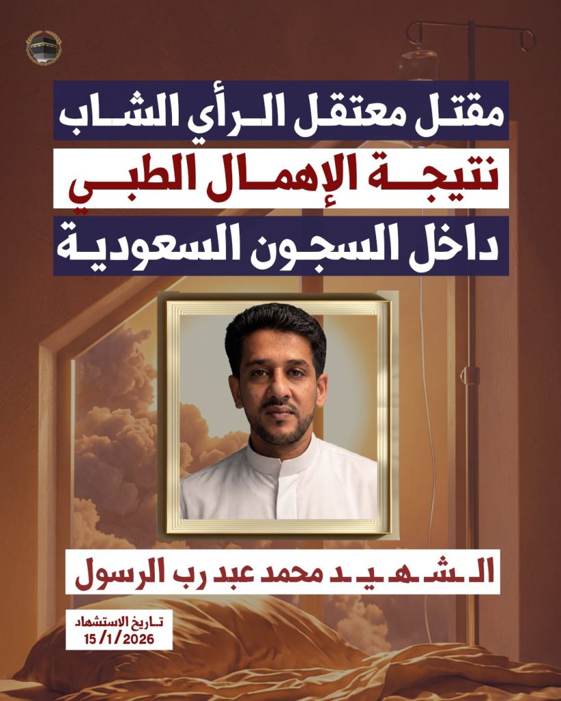 قتلت السلطات السعودية بالإهمال الطبي المتعمّد معتقل الرأي الشاب محمد عبد ربّ الرسول العليو، بعد تدهور حالته الصحية داخل السجن، نتيجة حرمانه من الرعاية الطبية اللازمة.